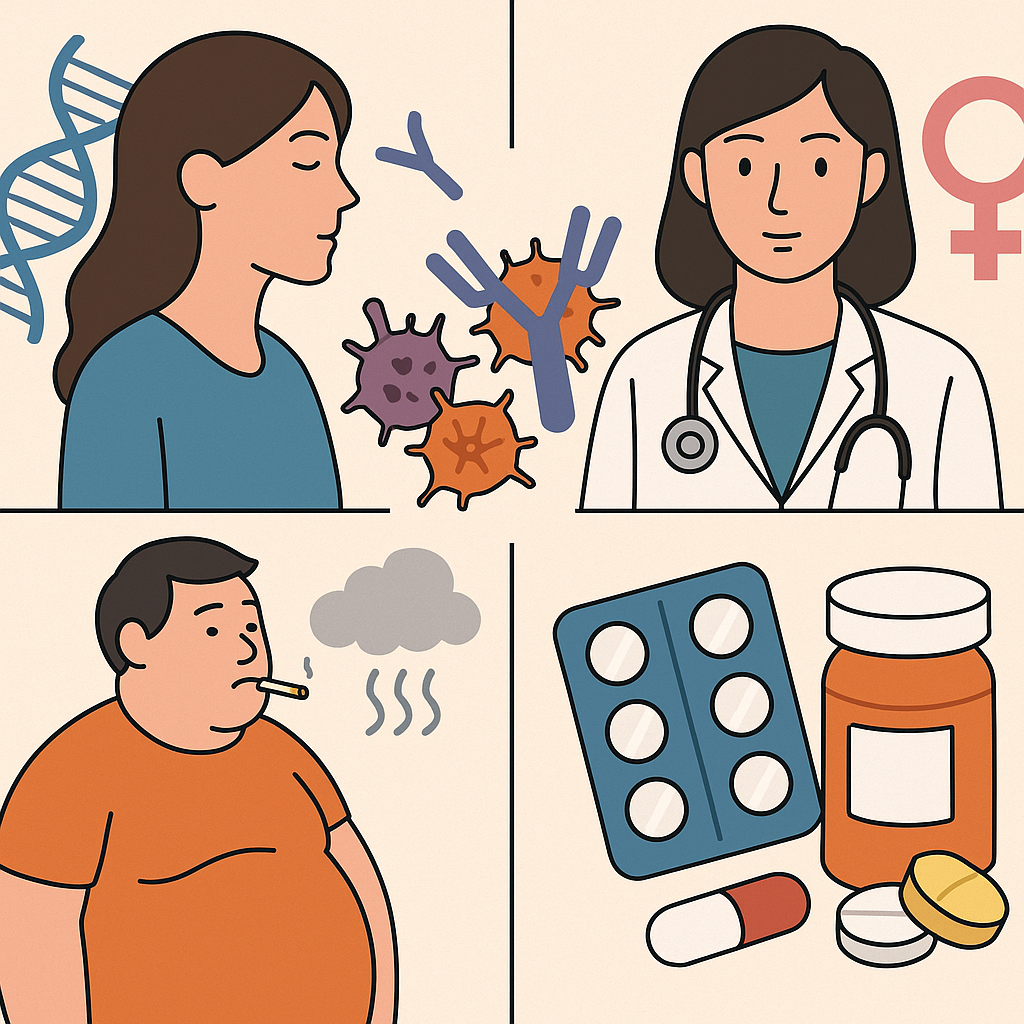 Les maladies auto-immunes n’ont pas une seule cause identifiée. Leur apparition résulte souvent d’une combinaison de facteurs. La génétique joue un rôle important : certaines maladies, comme le lupus ou la sclérose en plaques, sont plus fréquentes dans certaines familles. Le sexe intervient aussi, puisque près de 80 % des personnes touchées sont des femmes.