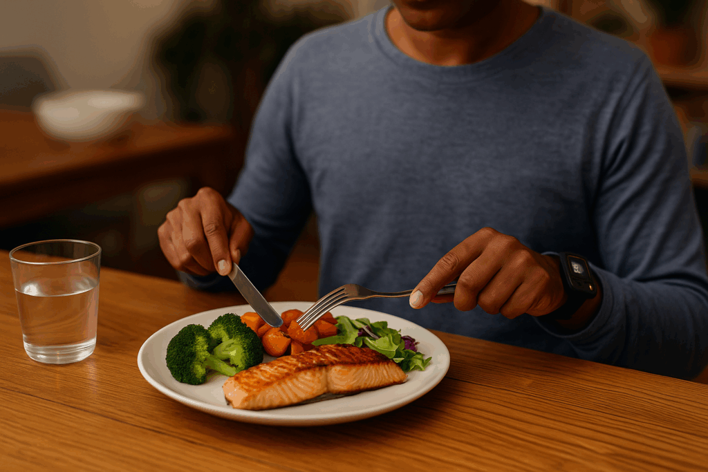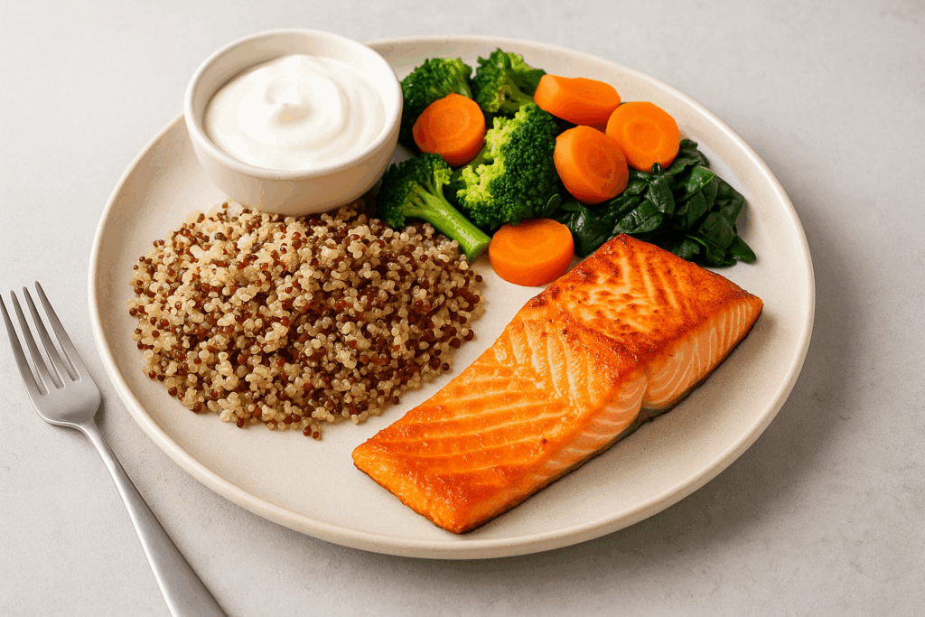 Le poisson est souvent conseillé comme source de protéines le soir : il est digeste, léger et riche en tryptophane, un acide aminé utile à la satiété et au sommeil. À cela s’ajoute une portion de légumes riches en fibres, indispensables pour ralentir l’absorption du glucose et favoriser un bon équilibre digestif.